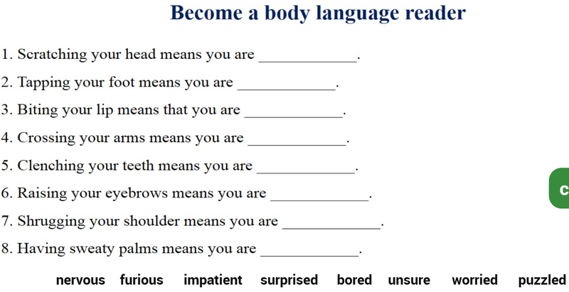 | 6. Match body language with the pictures - wordwall exercise | https://wordwall.net/ru/resource/21365912/spotlight-8-module-1a-body-language |