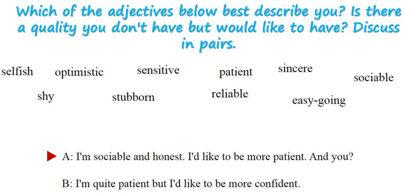 1a - Socialising Warm-Up Hello, my name is... What's yours? How old are you? How are you doing? How are you feeling today? (warm-up pics) Why? Explain how we'll work and ask about whether we need to follow the SB exactly as it is or not. I'll need help to decide what's best to do atm. You don't need me to help you with your homework, do you? Let's open SB at p.10. Here we have a text about breaking the ice. Do you know what it means? Look through the text and try to guess (Explain). Here are the words in bold that we'll work with, let's look through them together.Now let's read the text together understanding the meaning of the new words. Let's see if you can use them in a context. Let's do ex.4 at p.11. Now we'll look through some new words - character describing adjectives. Ex.5 - let's read. Which are positive? And negative? Watching the video (0:00 - 1:48) - character describing adjectives. Just try to remember and understand them. https://rutube.ru/video/0051b27af975477425fa9a7eb839fa1b/